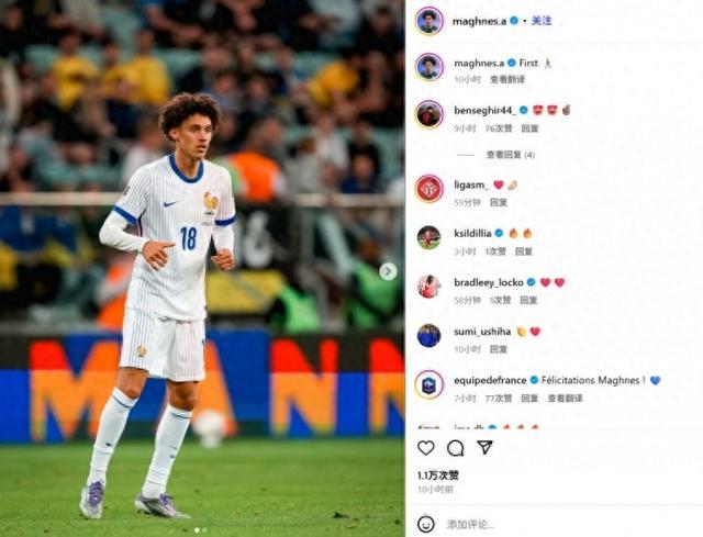 他也在赛后通过社媒晒出自己的比赛照,并配文:“第一次!”而法国队官方社媒也现身评论区送上“祝贺!”