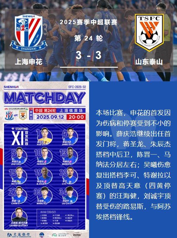 2025赛季中超联赛今天继续进行第24轮的争夺,上海申花坐镇主场迎战近期势头正盛的山东泰山。最终,申花因防线的两次失误葬送好局,与山东泰山战成3-3平。在争冠直接竞争对手上海海港与成都蓉城都获胜的情况下,本轮只取得1分的上海申花掉至联赛第三的位置。
