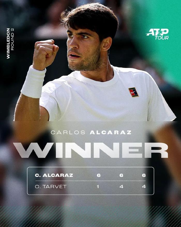 尽管阿尔卡拉斯惊险过关,但许多种子选手却没那么幸运。首轮过后,男单签表中共有13位种子选手出局,这是公开赛时代温网历史上最多的一次。第二轮中,阿尔卡拉斯以6-1 6-4 6-4击败资格赛选手塔韦特。