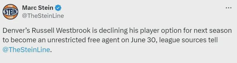 36岁威少拒绝执行25-26赛季年薪价值347万美元的球员选项,选择进入自由市场......