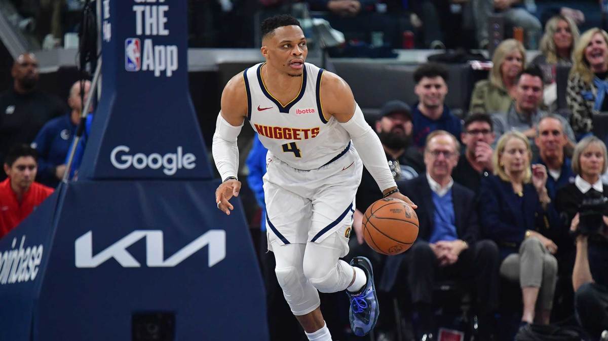 在Intuit Dome体育场举行的2024年NBA季后赛首轮第三场比赛上半场,丹佛掘金队后卫拉塞尔·威斯布鲁克(4号)在对阵洛杉矶快船队的比赛中带球推进。
