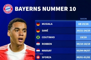 体育资讯7月1日讯 拜仁官方宣布,穆西亚拉将在世俱杯之后改穿10号球衣,德国转会市场列出了拜仁的10号球员。 德转列拜仁10号球员 穆西亚拉 (25/26-) 萨内 (20/21-24/25) 库蒂尼奥 (19/20) 罗本 (09/10-18/19) 马凯 (03/04-06/07) 斯福尔扎 (...