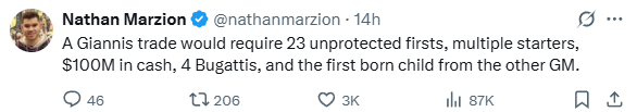 今日,雄鹿媒体Nathan Marzion发文称:“要在交易中得到字母哥,需要付出23个无保护首轮签+多名主力球员+1亿美金现金+4辆布加迪+对方总经理的头胎孩子。”