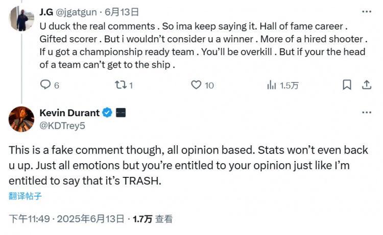杜兰特回复:“不过这是一条虚假评论,全是主观观点。数据甚至都无法支持你(的观点)。全是情感宣泄,但你有权持有自己的观点,就像我有权说这是垃圾一样。”