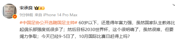 媒体人宋承良表示:“60岁以下,还是得年富力强,虽然国家队主教练比起俱乐部强度低很多了;然后目标2030世界杯,这个很明确了,虽然很难,但要竭力争取。”