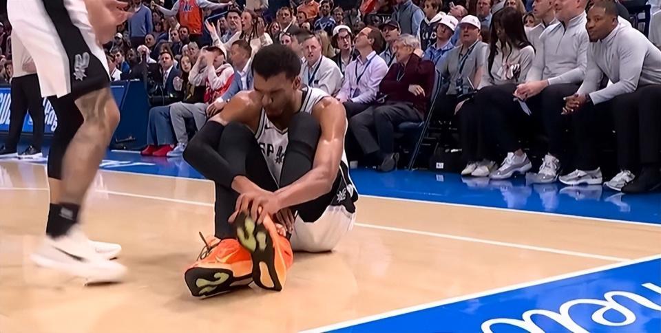 而这竟然只是一个插曲,一个序幕,这后面雷霆队的大动作还层出不穷。因为就在这个回合之后,文班亚马还遭遇了更狠的动作,在双方比分非常接近,亚历山大上篮被干扰的情况下,文班拿到篮板,结果被亚历山大双腿夹住腿,当场倒在了地上。